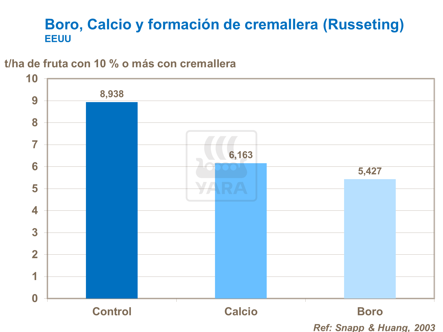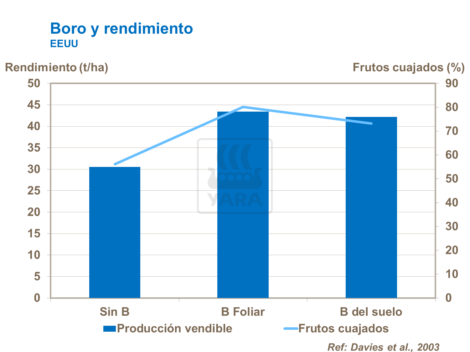 La deficiencia de boro restringe el crecimiento radicular e interrumpe las membranas celulares teniendo un efecto directo en los mecanismos de absorción de la planta. Por otra parte, un exceso de boro puede bloquear el transporte de calcio, así que es importante ajustarse a las tasas exactas de aplicación. El boro se acumula en los márgenes de las hojas, dejándolos negros. La marchitez radicular ocurre donde los niveles son particularmente altos. Los suelos con niveles altos de boro pueden corregirse con lixiviación.